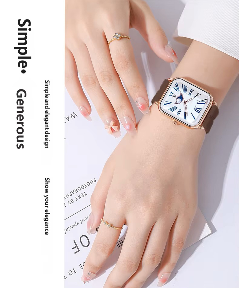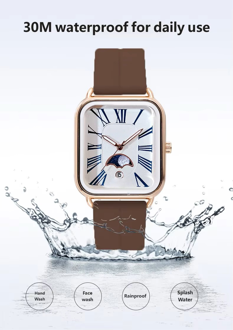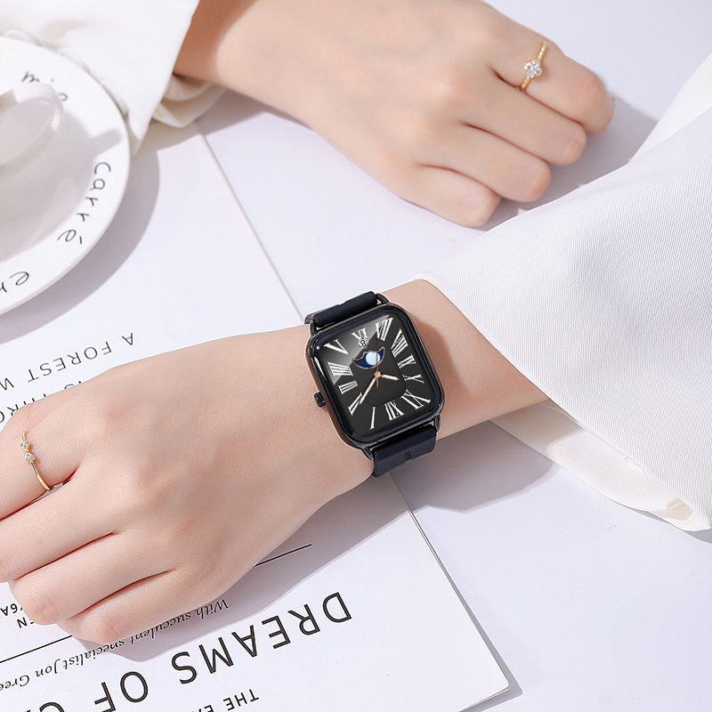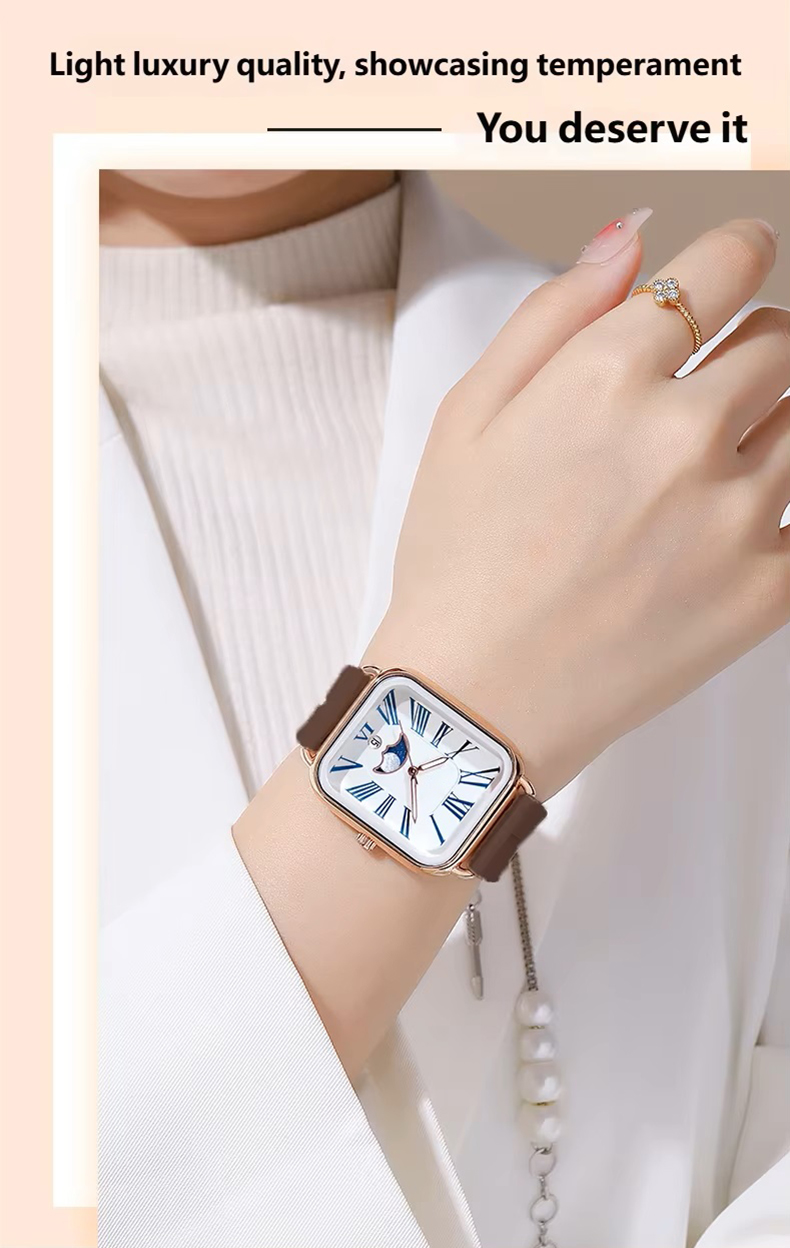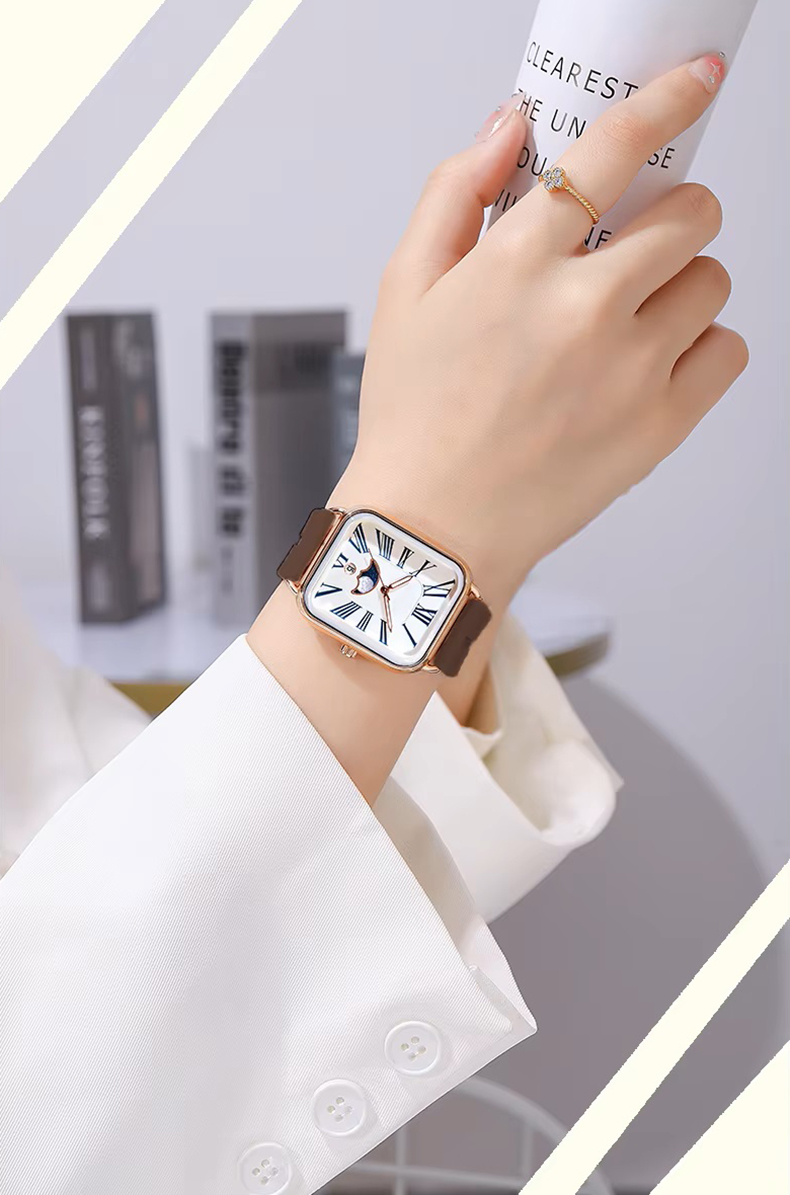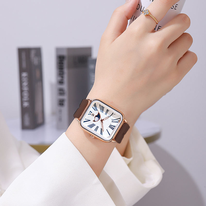 Fashion watch woman rectangular rose gold silicone strap luminous watch hands woman wristwatch calendar moonphase